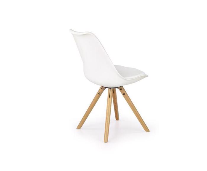 Jídelní židle K201 je vyrobena z bílého plastu, sedák z eko kůže. Masivní bukové nohy jsou opatřeny podložkou, která zabraňuje poškození podlahy. Výška sedu 48 cm. Barevné provedení židle se skvěle hodí do interiérů domácnosti, restaurací, kaváren a dalších veřejných prostor.