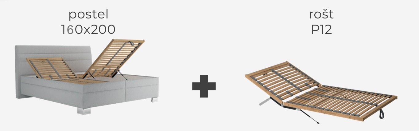 - Polohovací lamelové rošty disponuje roštem P12, který je tvořen 28 lamelami a plynovým pístem pro individuální nastavení polohy při spánku.