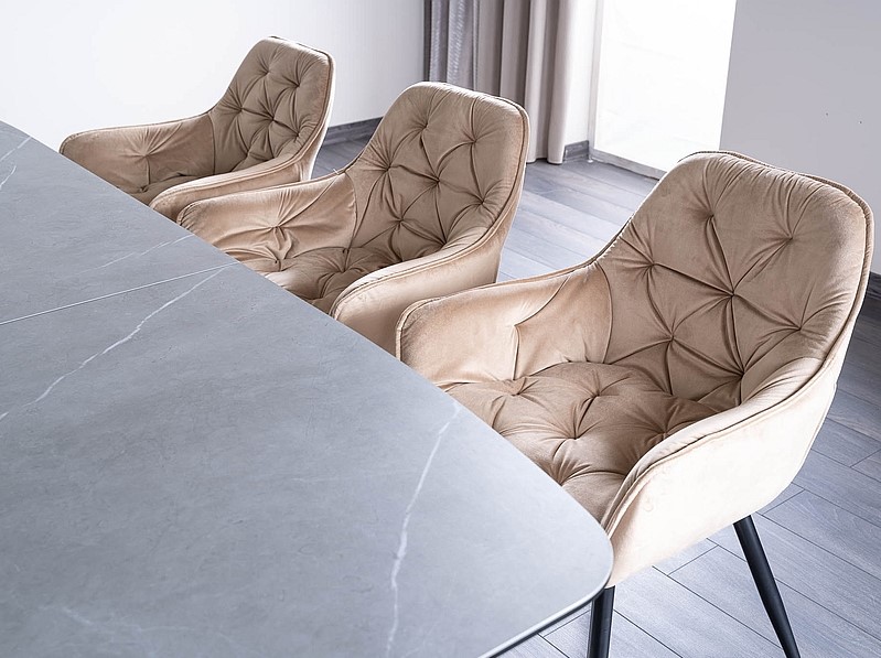 Křeslo Cherry s prošíváním ve stylu Chesterfield je luxusní volbou pro jídelnu, obývací pokoj i pracovnu. Jeho sametový povrch a prošívání dodávají prostoru sofistikovaný vzhled. Poskytuje pohodlí a podporu pro dlouhé posezení a díky univerzálnímu designu se snadno přizpůsobí různým prostorům.