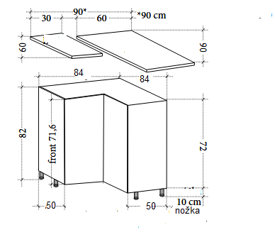 Spodní rohová skříňka široká 84 na 84 cm. Nutné počítat s šířkou 90 na 90 cm. Skříňka je univerzální (pravé a levé provedení). Korpus lze volit v odstínu lamina o síle 18 mm v bílé, šedé, lava, černé a dub artisan. Nový typ dvířkoviny se zafrézovaným úchytem o síle 19 mm je v barvě Bílý a Šedý lesk. Vnější a vnitřní strany čel jsou plně zakryté. Hrany čel jsou zajištěny ABS hranami.