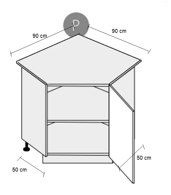 Spodní skříňka rohová šířky 90 cm (s pracovní deskou). Skříňka je v pravém provedení, s policí. Korpus lze volit v odstínu lamina o síle 18 mm v bílé, šedé, lava, černé a dub Artisan. Nový typ dvířek se zafrézovaným úchytem o síle 19 mm v odstínu Bílý Akryl Mat, Kašmír, Matná Černá, Šedý Akryl, Grafit Grey, Reed Green, Stone Grey. Vnější a vnitřní strany čel jsou plně zakryté. Hrany čel jsou zajištěny ABS hranami. Dvířka lze kombinovat s kuchyněmi VELDEN, TREVISO, VIANO, CARRINI.