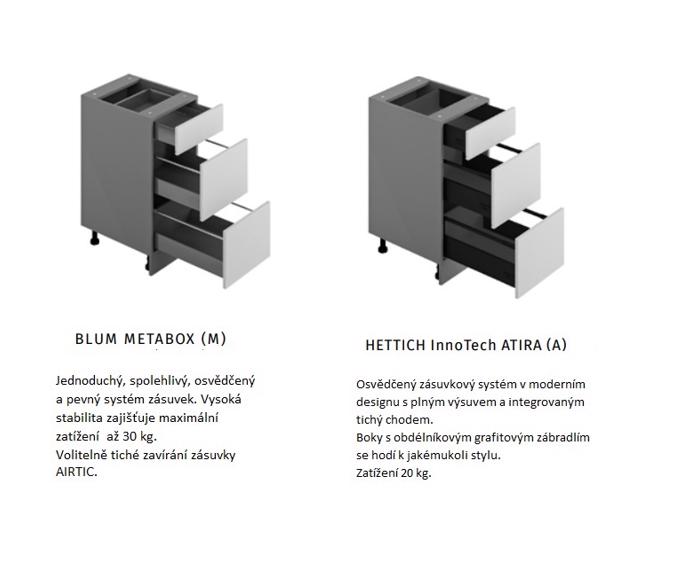 Spodní skříňka vysoká šířka 60 cm. Skříňka je univerzální ( pravé a levé provedení). Ve spodní části jsou s třemi šuplíky. Zásuvky jsou opatřeny kvalitními metaboxovými pojezdy. Za příplatek lze objednat Hettich InnoTech Atira. Skříňka je na rektifikačních nožkách se soklem výšky 10 cm ve standardu. Za příplatek lze doobjednat rektifikační nožky bez soklu o výšce 15 cm. Vyšší sokl 15 cm nutné dokoupit.