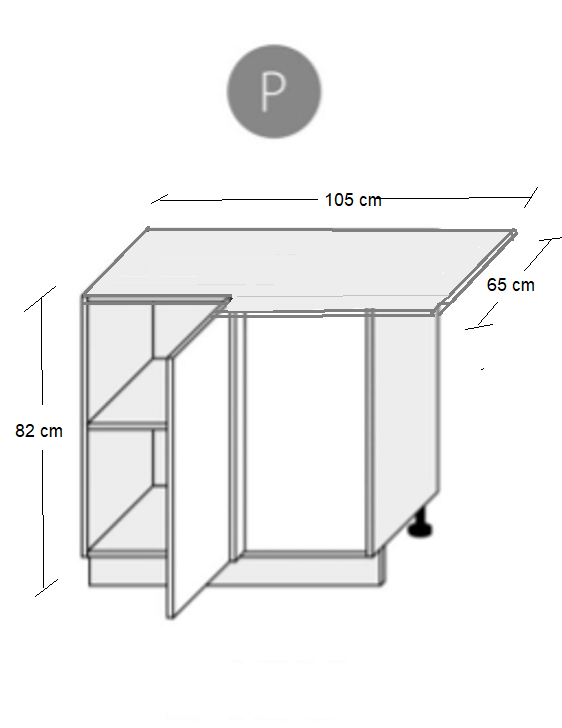 Spodní skříňka rohová šířka 105 x 65 cm. Skříňka je v pravém provedení. Korpus lze volit v odstínu lamina o síle 18 mm v bílé, šedé, lawa, černé a dub Artisan. Nový typ dvířkoviny se zafrézovaným úchytem o síle 19 mm v sedmi odstínech.