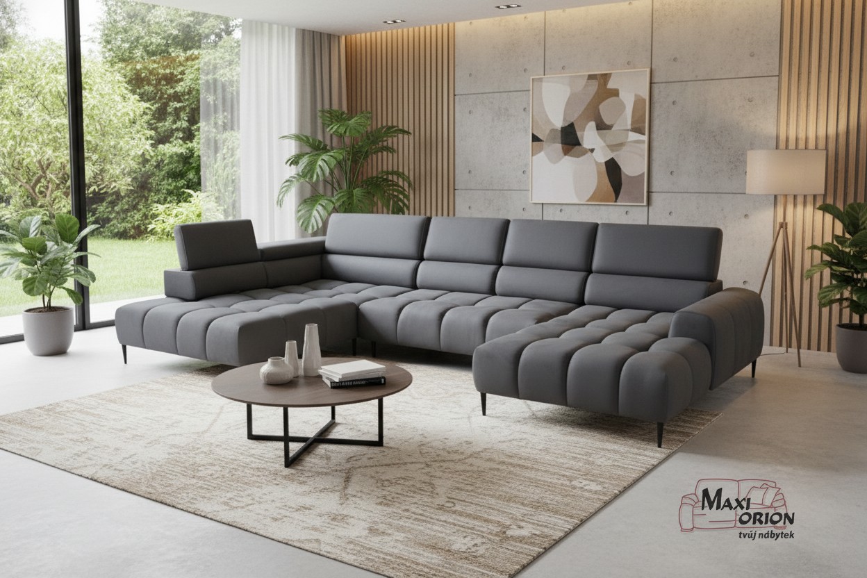 Objevte dokonalé spojení pohodlí, stylu a moderních technologií s elektrickou rozkládací sedací soupravou do U – Elektric XL v elegantní tmavě šedé barvě. Tato luxusní sedačka, čalouněná odolnou látkou Solar 96, zaujme svým sofistikovaným vzhledem. Díky elektrickému rozkladu, výsuvné relaxační funkci a šesti polohovatelným záhlavníkům si snadno přizpůsobíte sezení přesně podle svých představ. Pevná konstrukce z masivního dřeva a dřevotřísky, v kombinaci s PUR pěnou a pružinami faliste. Celek elegantně doplňují vysoké černé kovové nožky, které dodávají sedací soupravě vzdušnost a moderní vzhled.