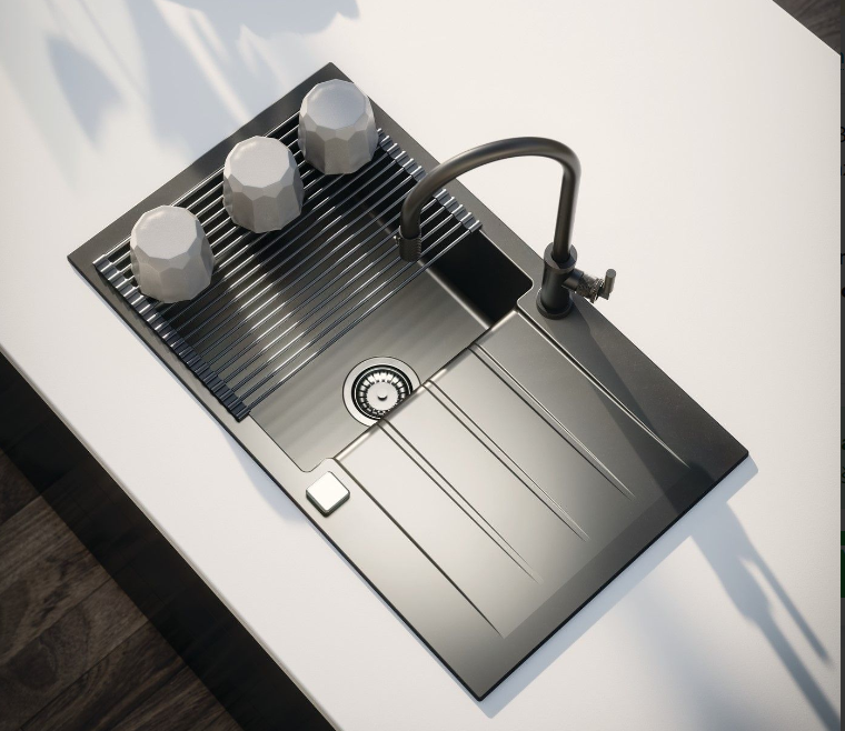 Složení materiálů: 70% přírodních křemičitých písků (jednotlivé materiály mají různou hrubost zrn použitých písků), 5% barevných pigmentů a 25% polymerové pryskyřice jako pojivo. Další vlastnosti: Exkluzivní, elegantní a neobvyklý vzhled velmi prostorné mycí nádoby, hluboké vaničky pez povrchové úpravy lakem, smaltem apod. homogenní struktura a barevnost v celé šířce materiálu, testovaná odolnost vůči dopadu 2kg hrnce z výšky 1m, odolnost vůči vrypu teplotní odolnost do 180°C, velmi krátkodobě až do 280°C, masivní a tuhé dřezy – baterie a drtiče se neviklají, dřezy nerezonují, odolnost vůči běžným čistícím prostředkům, chemikáliím a bělidlům používaným v kuchyni, částečná opravitelnost (vybroušením v případě rýhy apod.)