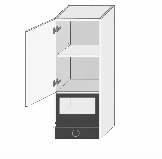 Horní skříňka vysoká 96 cm kombinovaná, šířky 60 cm v levém provedení, vhodná na umístění vestavné mikrovlnné trouby. Korpus lze volit v odstínu lamina o síle 18 mm v bílé, šedé, lava, černé a dub Artisan. Nový typ dvířek se zafrézovaným úchytem o síle 19 mm. Díky inovativní technologii si můžete vytvořit originální design kuchyně, který je charakteristický spojením ergonomie a designu.
