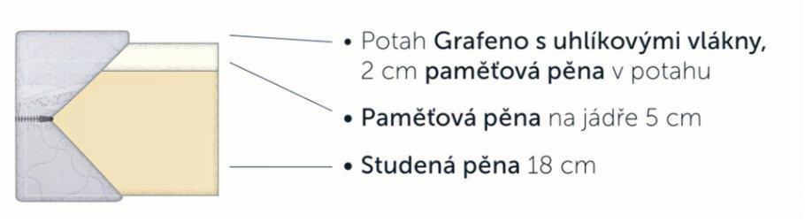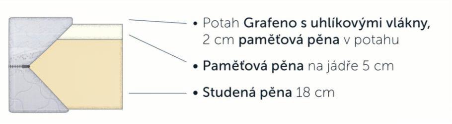 - Složení: 18 cm studená pěna Leyafoam, 5 cm paměťová pěna v jádru, 2 cm paměťová pěna v potahu.