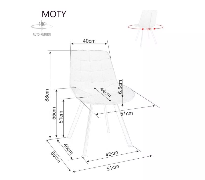 Otočná jídelní židle Moty Velvet je konstruována z odolného kovového rámu, v černé matné barvě. Otočný mechanismus se otáčí o 180°. Tento pevný rám je čalouněný šedou sametovou látkou Bluvel. Židle stojí na černých kovových nožkách a její maximální zatížení je 120 kg.