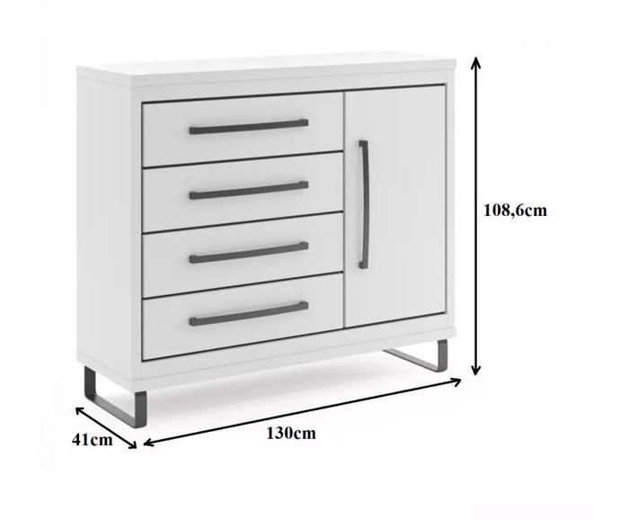 Komoda 4S 4S1D CAPRI C04, bíláSystém Capri se vyznačuje industriálním stylem - nábytek je vybaven širokými, kovovými černými úchyty a umístěn na černých vysokých kovových nohách, které usnadňují úklid místností. Kolekce Capri je elegantní a minimalistický nábytek, který najde uplatnění v mnoha inter