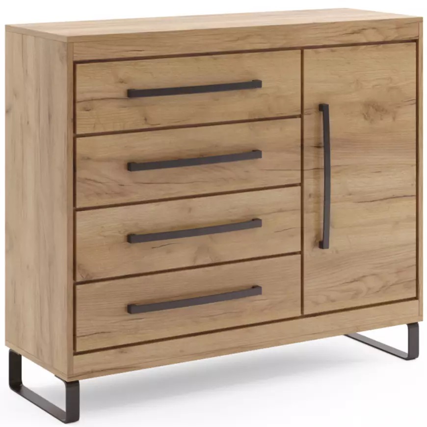 Komoda 4S 4S1D CAPRI C04, Craft zlatý je vyrobena z 16 mm lamina s ABS hranou odolného proti poškrábání a vlhkosti. Komoda je rozdělena na 4 praktické zásuvky, nabízí dostatek úložného prostoru. Zásuvky jsou vybaveny kuličkovými pojezdy. Komoda je umístěna na nožkách.