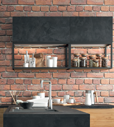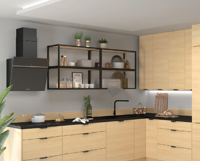 Pevná kovová konstrukce v černé matné barvě zajišťuje dlouhou životnost a nadčasový design, který se snadno kombinuje s dřevěnými i laminovými dekory. Nástavec působí elegantně a zároveň přidává další úložný prostor pro dekorace, nádobí či kořenky.
