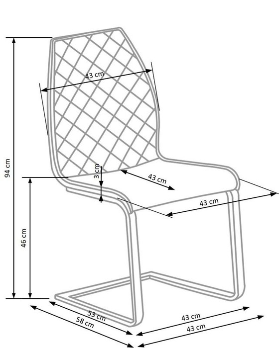 Jídelní židle K265 43 x 58 x 94 cm nohy jsou vyrobeny z černého kovu, sedák a opěrák je potažen hnědou koženkou, záda z laminované překližky. Výška sedu je 46 cm.