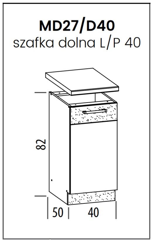 Rozměry skříňky (V x Š x H): 82 x 40 x 50 cm. Spodní skříňka s dvířky (pravé nebo levé provedení) a jednou zásuvkou o šířce 40 cm, je vyrobena z kvalitní LTD. Korpus RIJEKA SVĚTLÁ – lamino 16 mm. Spodní skříňky jsou vysoké 82 cm i s pevným soklem (10 cm). Úchytky jsou plastové v odstínu kovu. Kovové pojezdy METABOX v zásuvkách, regulovatelné ve třech úrovních. Horní skříňky otvíráme pomocí plynových pístů. Všechny díly kuchyňské linky Modena máme skladem v externím skladě. Termín dodání 2 - 3 týdny od objednání.