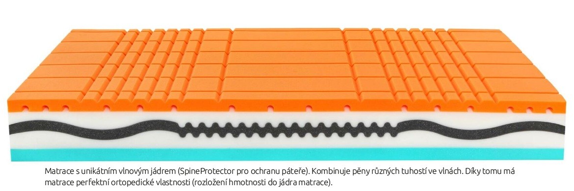 - Unikátní vlnové jádro SpineProtector: Střední část matrace napodobuje tvar páteře a kombinuje pružné pěny různých tuhostí. Zajišťuje tak dokonalé rozložení tlaku a správnou podporu těla v jakékoli poloze.