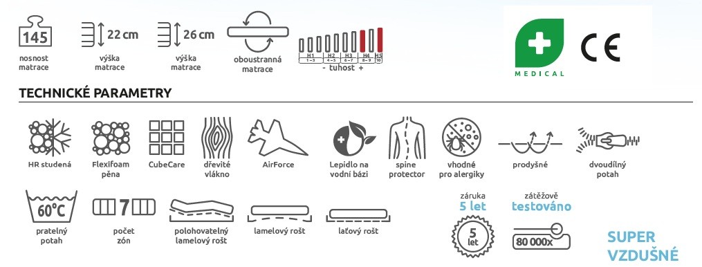 - Vysoká odolnost a záruka: Český výrobek s prodlouženou zárukou 5 let na jádro matrace.