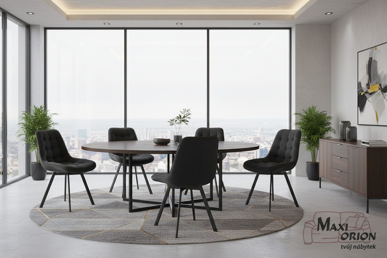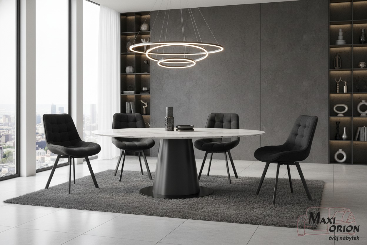 - Otočná jídelní židle Moty Velvet je postavena na pevné konstrukci z práškově lakované oceli v černé matné barvě, která vyniká mimořádnou odolností proti poškrábání i korozí a dlouhodobě si zachovává elegantní vzhled bez známek opotřebení.