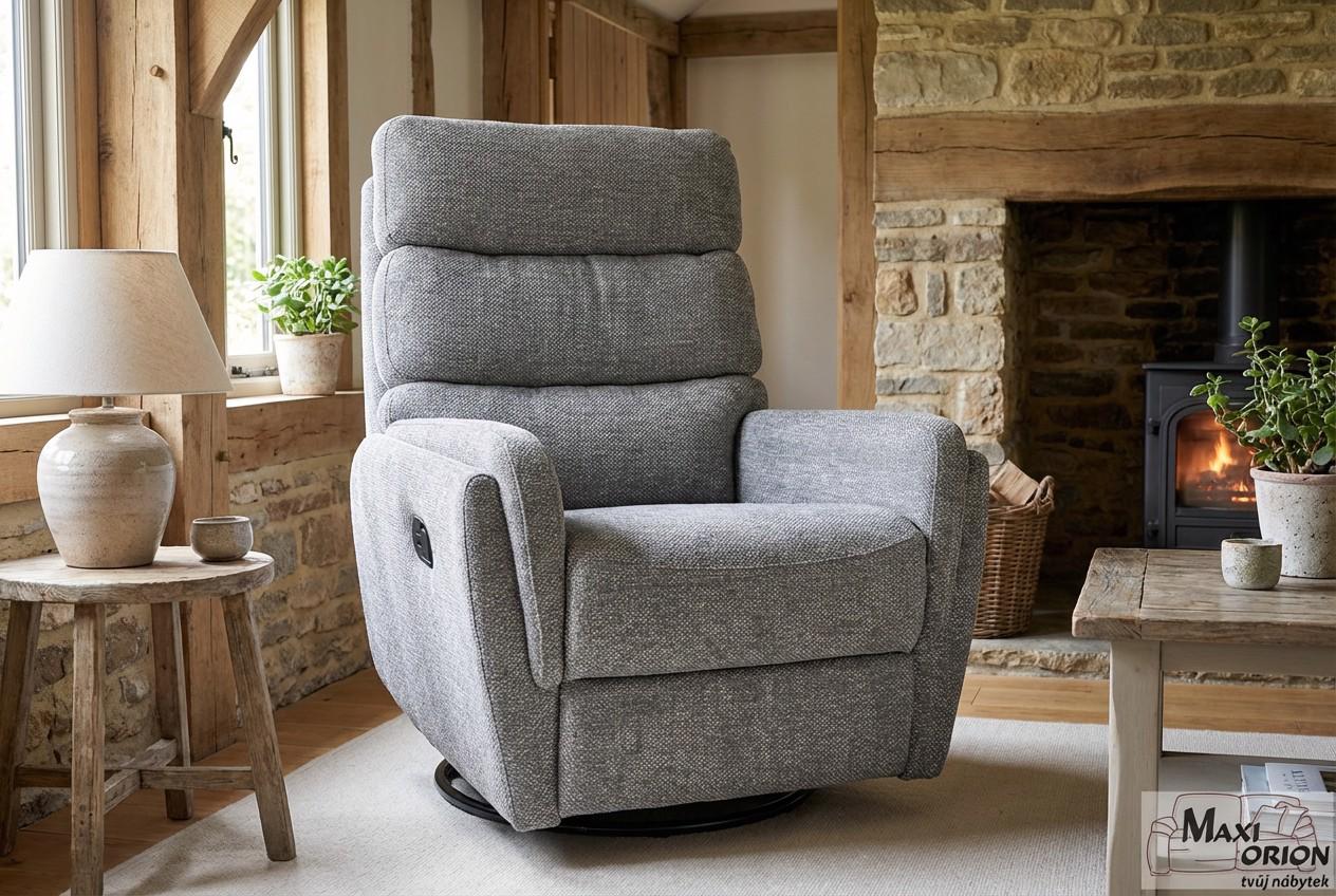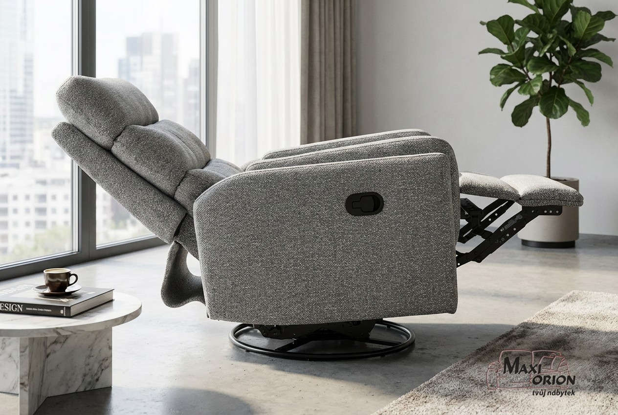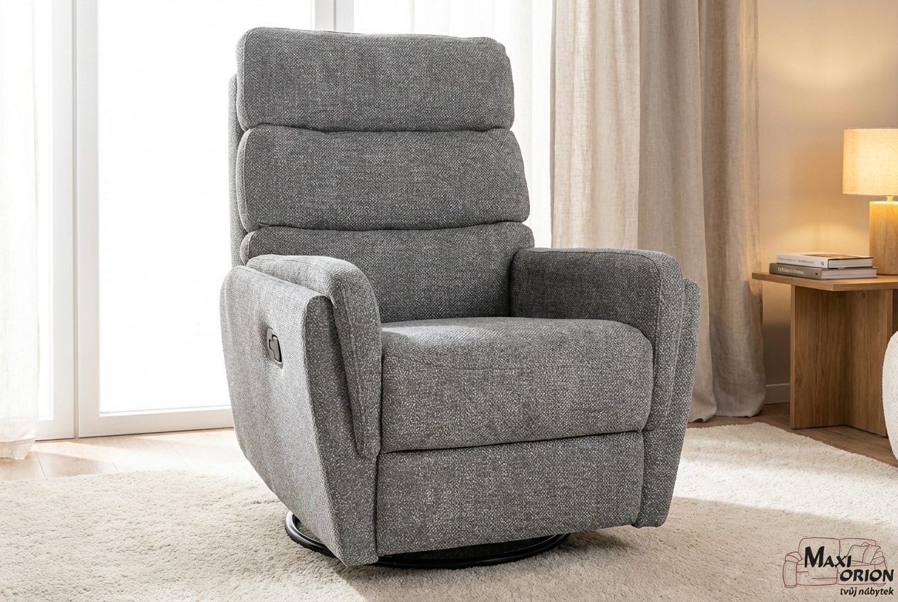 Relaxační otočné a houpací křeslo Raven – šedé, pro seniory - luxus po náročném dni, ukázka interiéru