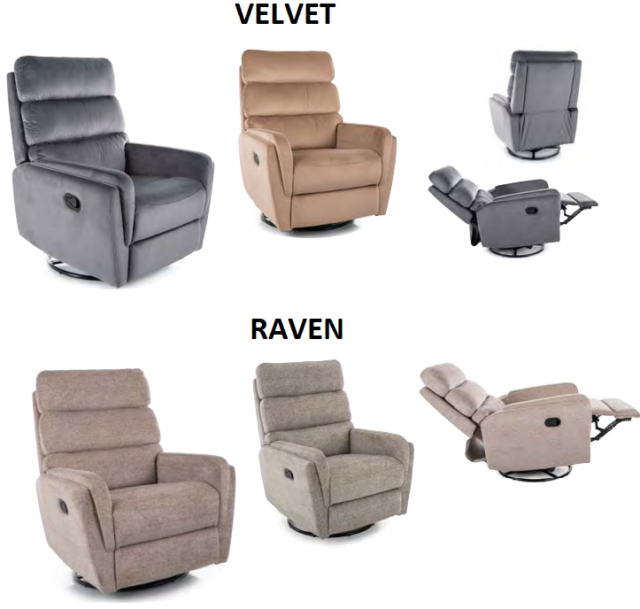 Relaxační křeslo je k dispozici ve dvou typech látky – Velvet a Raven, přičemž každý typ nabízí několik barevných možností. Vybrat si můžete z těchto kombinací: