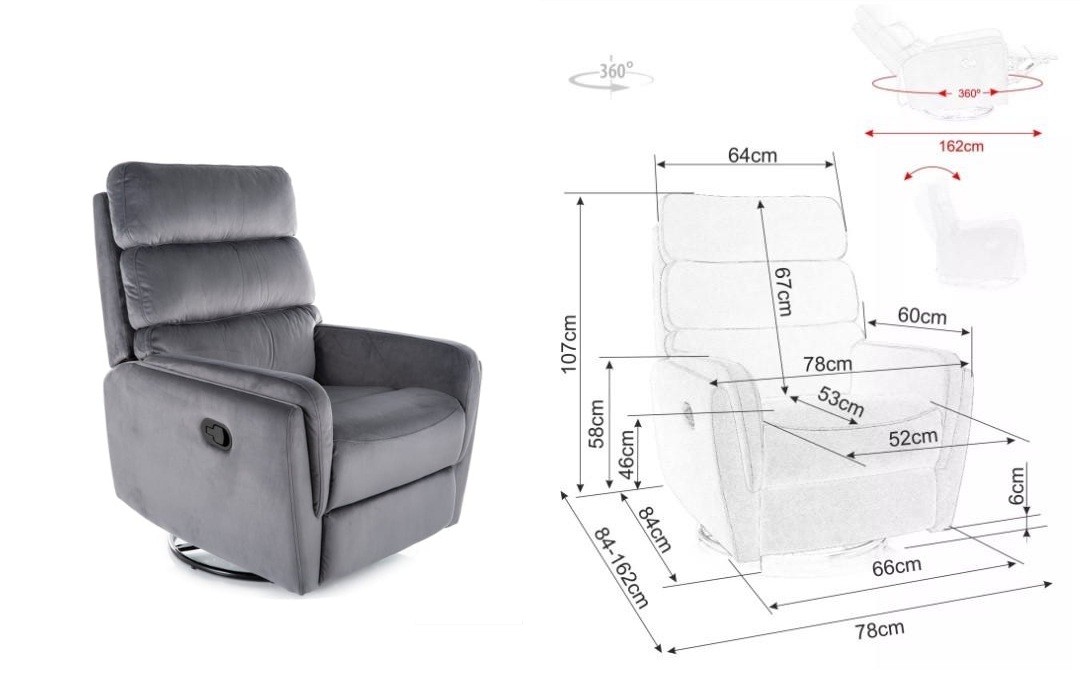- Vzdálenost pro rozložení: Vzhledem k délce 162 cm v relaxační poloze doporučujeme umístit křeslo alespoň 30–50 cm od stěny, aby se dalo plně sklopit.