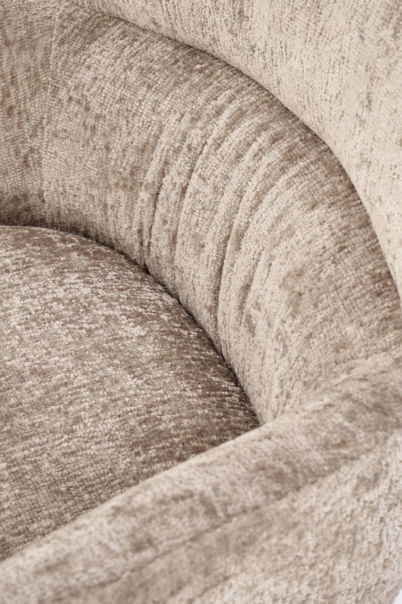 Čalounění z jemně strukturované tkaniny se žíhaným efektem dodává křeslu charakter a vizuální hloubku. Decentní vodorovné prošívání opticky členící opěrku podtrhuje moderní design. Stabilní kovová podnož s otočnou funkcí je zakončena kluzáky, které zabraňují posunu po podlaze.