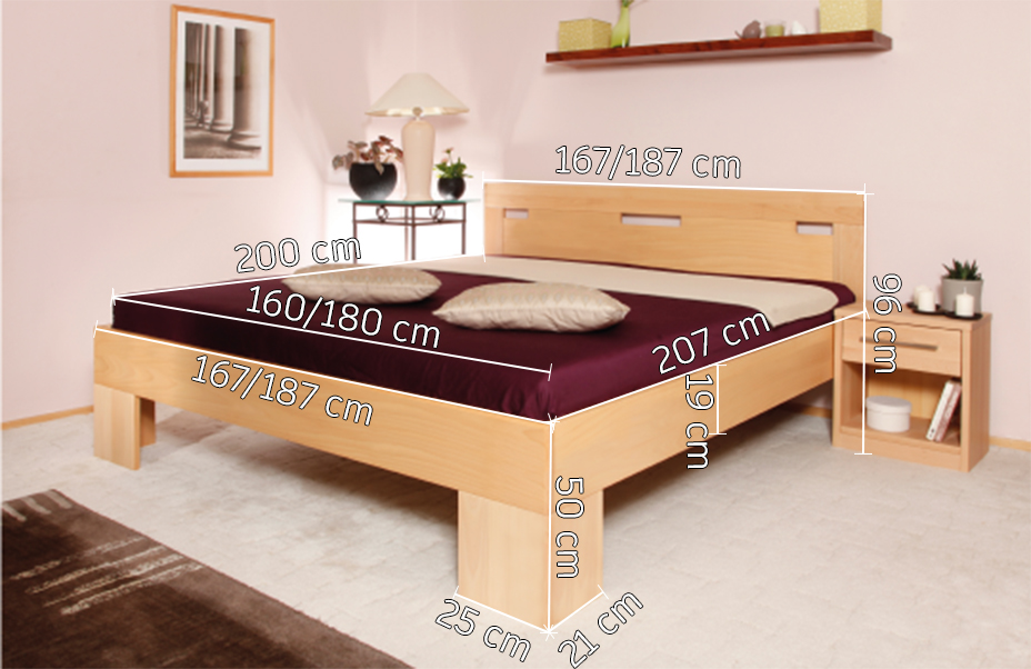 Výška postranice postele 50 cm. Výšku roštu pro matraci lze nastavit do čtyřech poloh od 32cm do 40cm (včetně lamelového roštu o výšce 4cm) pomoci nastavitelného kování. Při matraci 25 cm je výška lehací plochy až 65 cm což zaručuje pohodlné vstávání z lůžka. Do postele je potřeba zakoupit lamelový rošt který se jednoduše uloží na polohovatelné kování a kvalitní matrace, které jsou částečně uložené v posteli tím to předchází nechtěnému posuvu matrace.