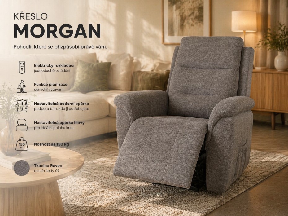 Křeslo MORGAN je navrženo tak, aby se přizpůsobilo Vašemu tělu. Díky elektrickému mechanismu si snadno nastavíte ideální polohu – od klasického sezení až po plný relax s oporou nohou.