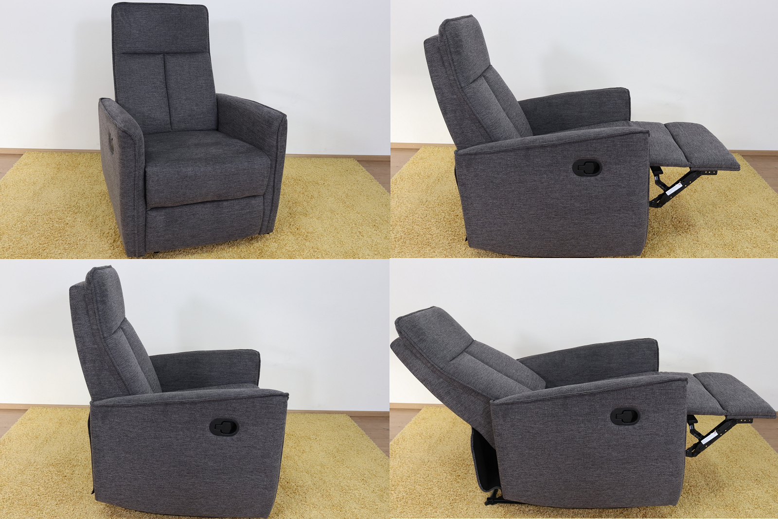 Křeslo je čalouněné jemnou, odolnou látkou Brego 18 v tmavě šedé barvě, příjemné na dotek i na pohled. Stabilní základ tvoří černý kovový rám, který ladí s celkovým moderním vzhledem. Křeslo se rozkládá pomocí páčky na boku – po jejím zatáhnutí se vysune podnožka a sklopí opěrák, čímž vznikne ideální pozice pro relaxaci.