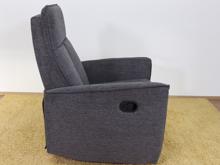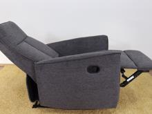 Křeslo je čalouněné jemnou, odolnou látkou Brego 18 v tmavě šedé barvě, příjemné na dotek i na pohled. Stabilní základ tvoří černý kovový rám, který ladí s celkovým moderním vzhledem. Křeslo se rozkládá pomocí páčky na boku – po jejím zatáhnutí se vysune podnožka a sklopí opěrák, čímž vznikne ideální pozice pro relaxaci.