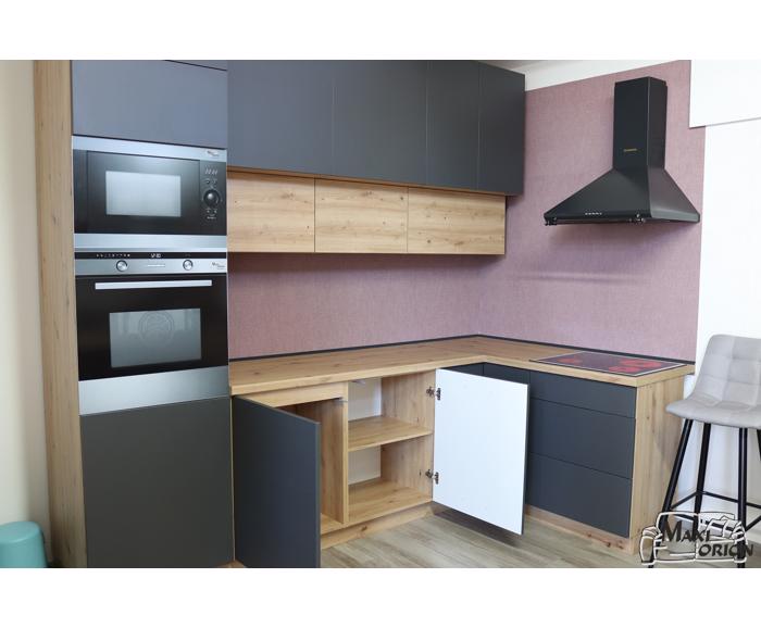 nadčasová rohová kuchyňská linka LANGEN 270/ 150 cm má široký výběr praktických skříní různých hloubek, korpus v univerzální barvě Dub Artisan v kombinaci GREY MAT(MDF) v kombinaci s dubem Artisan. Tato kuchyňská linka má neomezené možnosti konfigurace a dokonale vyplní každý volný prostor. Volen systém push-2-open. Závěsy jsou s tíchým dovíráním a zásuvky s plnovýsuvem bez tichého dovírání. Termín dodání 5 - 7 týdny od objednání.