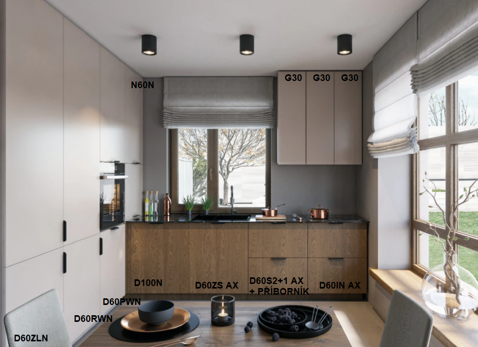 Cena nezahrnuje spotřebiče, dřez s baterií, montáž, sokl a pracovní desku.