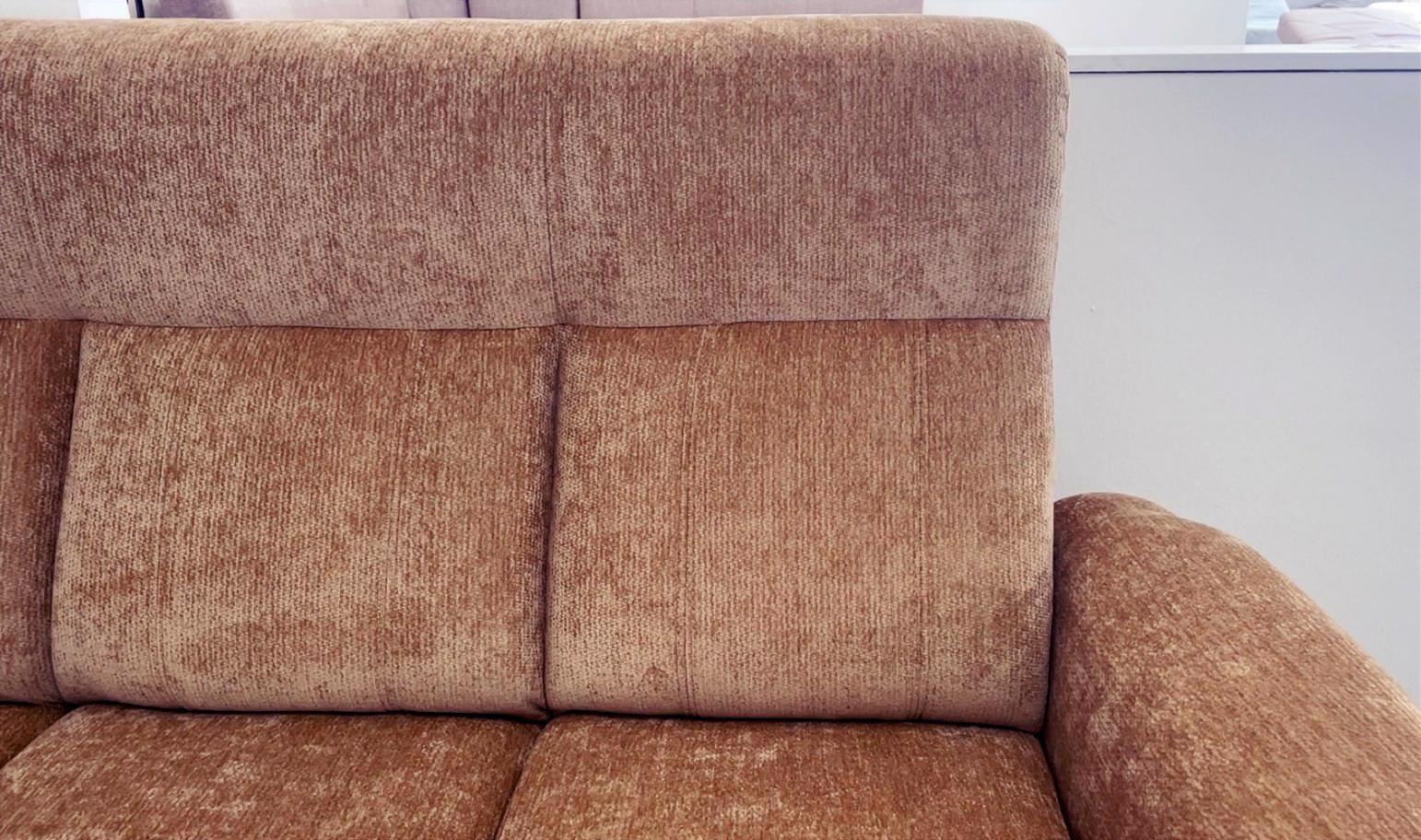 Čalounění v prémiovém veluru Vibe 14 v atraktivním odstínu rustikální oranžové. Všimněte si precizního zpracování a elegantního prošití opěrek, které dodává sedací soupravě luxusní vzhled.
