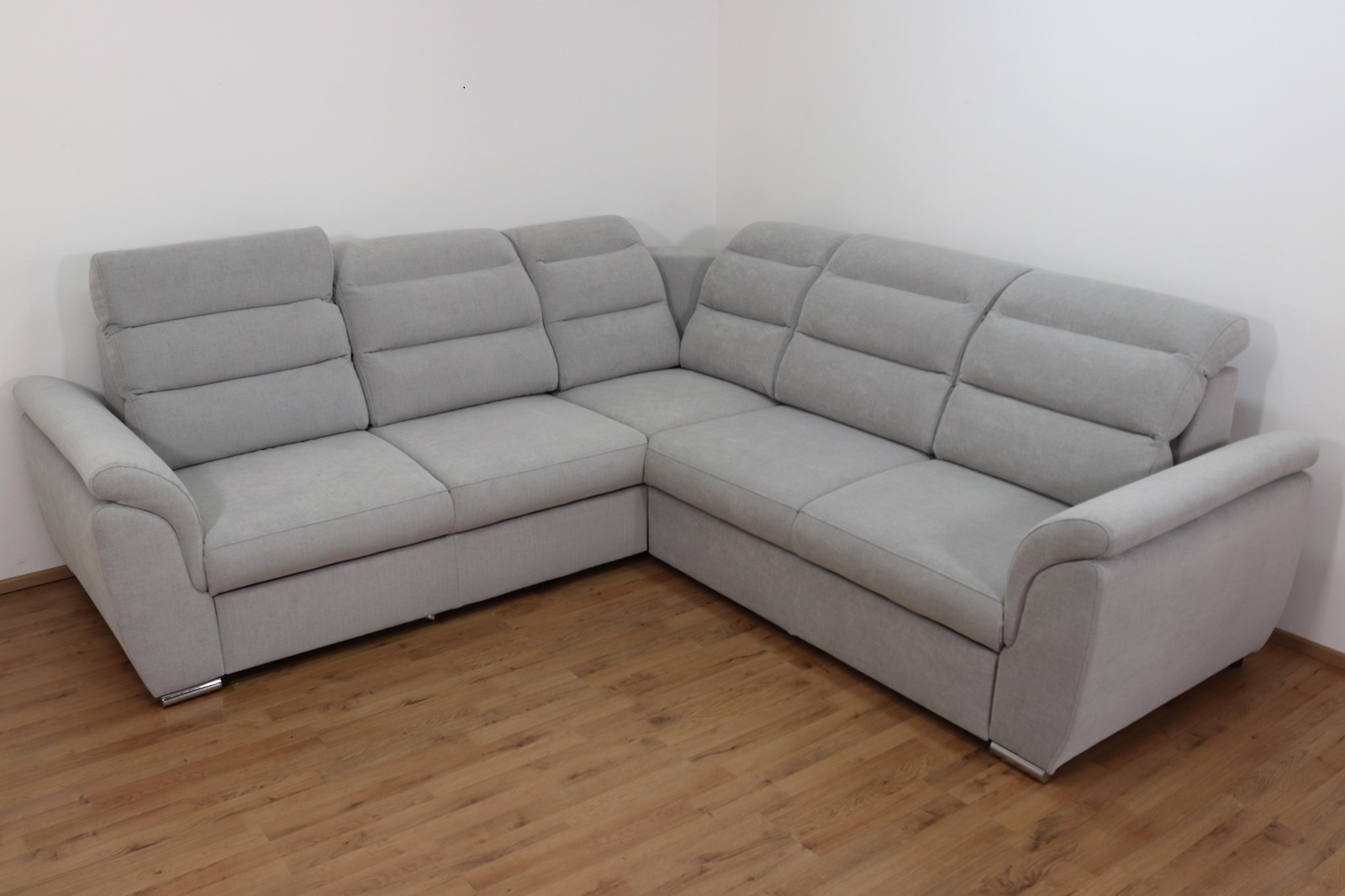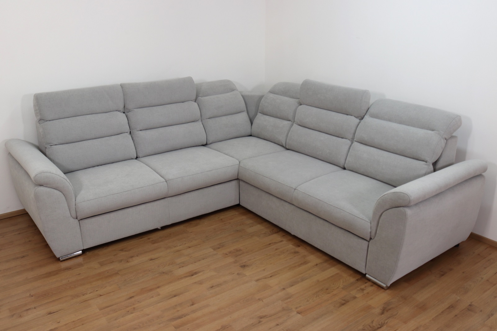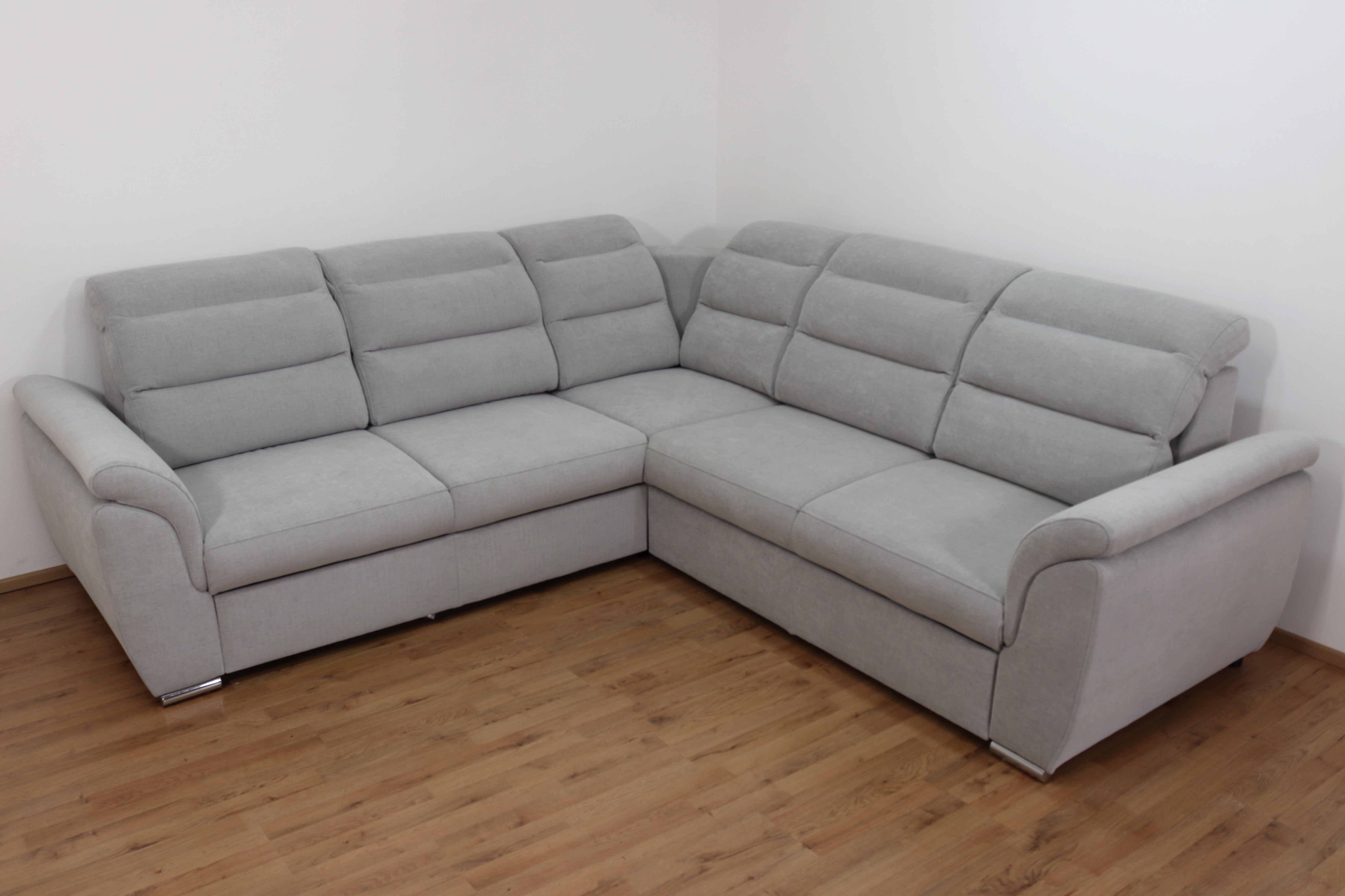 Rohová rozkládací sedací souprava Medium v elegantní šedé barvě má moderní design. Nabízí 4 polohovatelné záhlavníky pro maximální pohodlí, rozklad typu delfín (180x120cm) pro snadné vytvoření lůžka a vysouvací úložný prostor na deky či polštáře. Stabilní kovové nohy podtrhují její styl a odolnost, zatímco kvalitní látka Moly 80 zajišťuje příjemný dotek i dlouhou životnost. Ideální volba pro moderní interiér, kde se pohodlí snoubí s elegancí.
