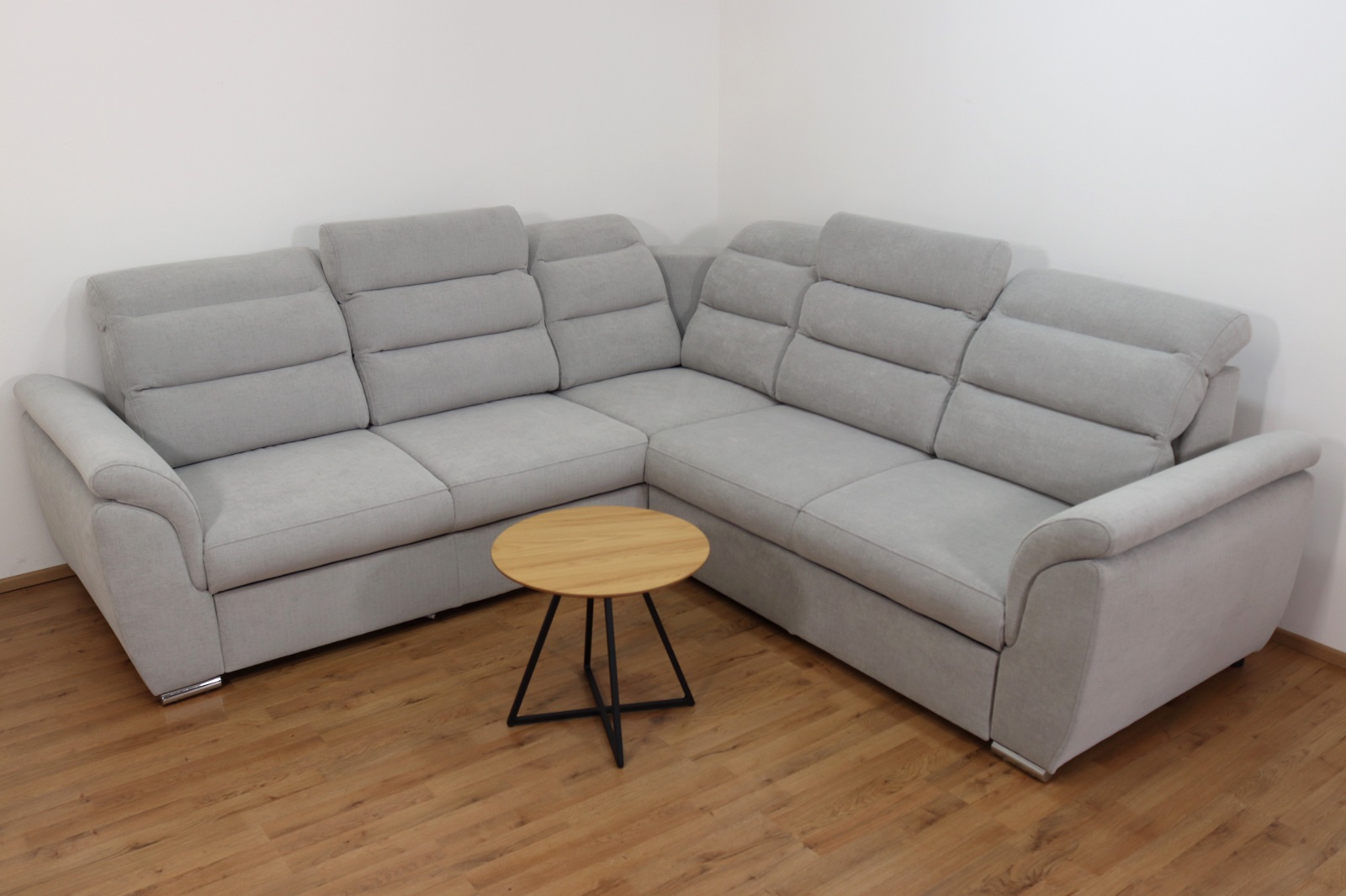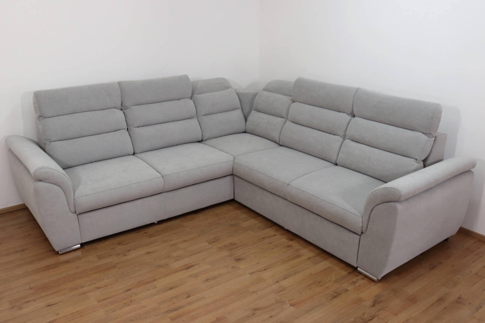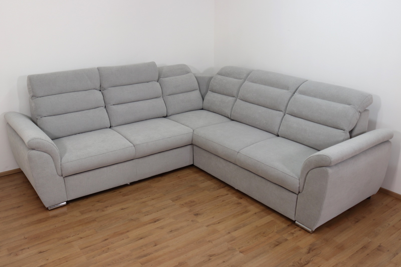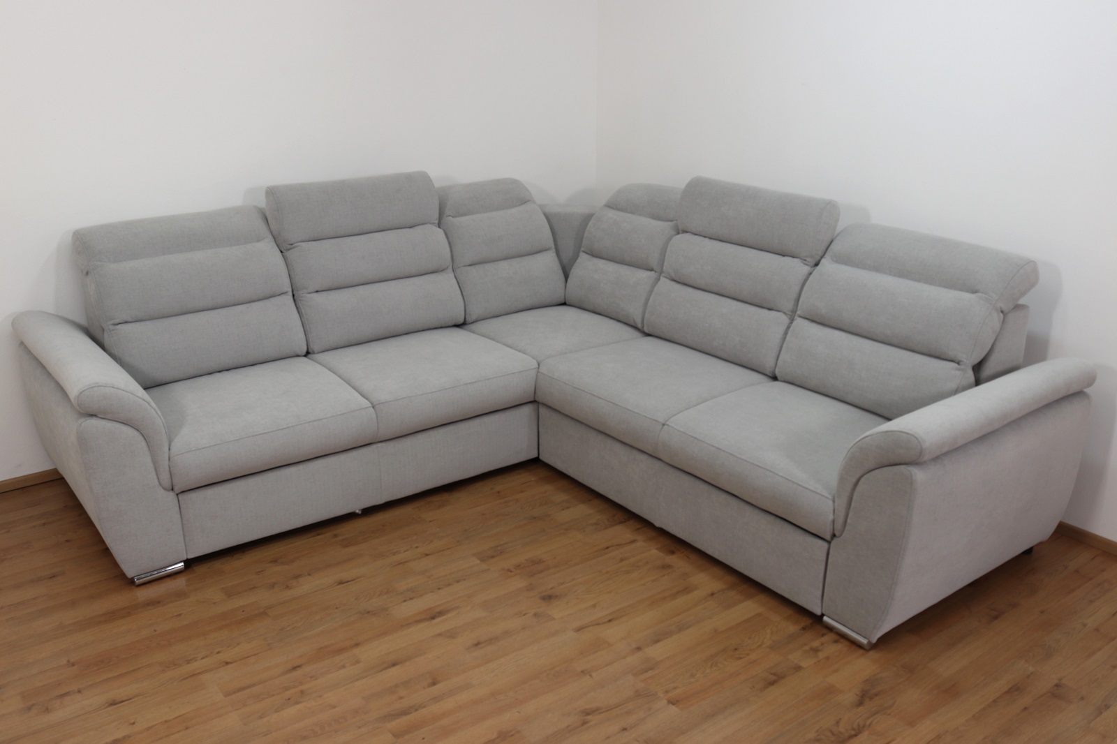 Rohová rozkládací sedací souprava Medium v elegantní šedé barvě má moderní design. Nabízí 4 polohovatelné záhlavníky pro maximální pohodlí, rozklad typu delfín (180x120cm) pro snadné vytvoření lůžka a vysouvací úložný prostor na deky či polštáře. Stabilní kovové nohy podtrhují její styl a odolnost, zatímco kvalitní látka Moly 80 zajišťuje příjemný dotek i dlouhou životnost. Ideální volba pro moderní interiér, kde se pohodlí snoubí s elegancí.