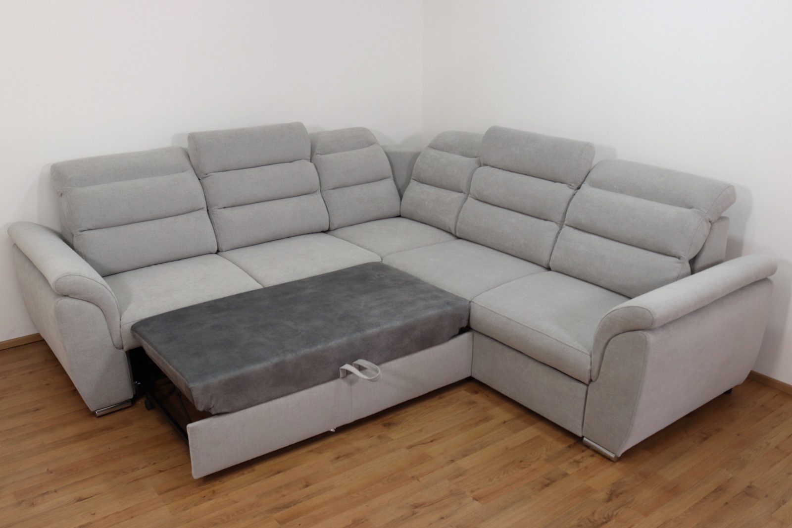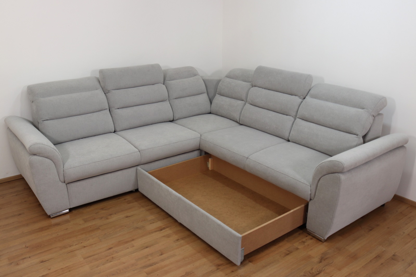 Sedací souprava je vybavena velkým vysouvacím úložným prostorem, který je řešen prakticky jako šuplík. Nabízí dostatek místa pro uložení přikrývek, polštářů nebo sezónního textilu, takže budete mít vše po ruce a zároveň udržíte v obývacím pokoji pořádek. Díky snadnému vysouvání je manipulace s prostorem rychlá, tichá a pohodlná, což oceníte při každodenním používání.