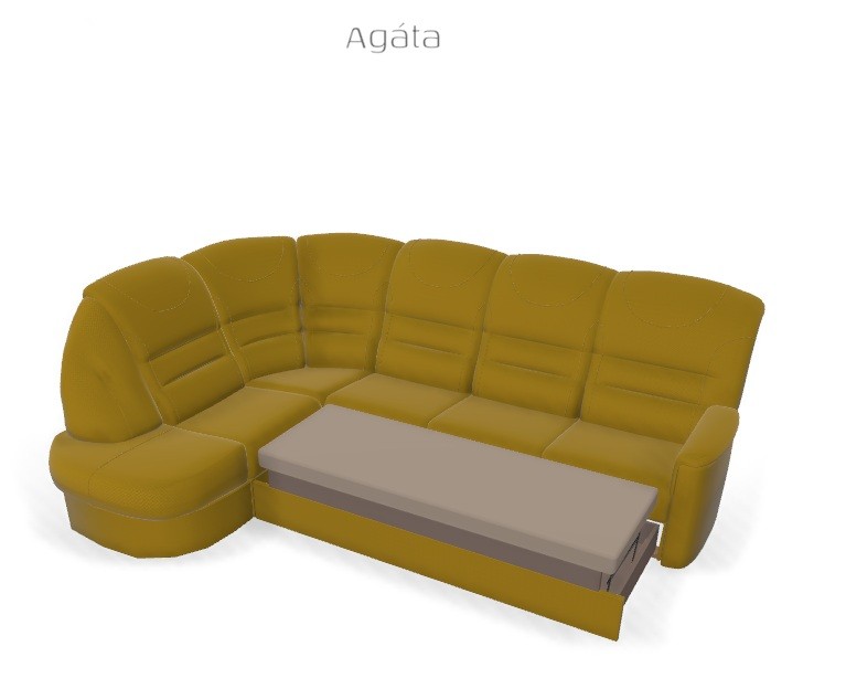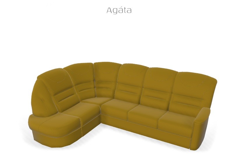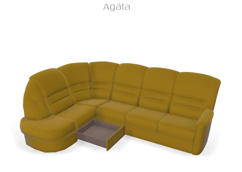 Sedací souprava Agáta kombinuje praktický trojsedák s rozkladem, rohový modul a jednosedák s úložným prostorem pro maximální využití. Souprava je ukončena z jedné strany područkou a z druhé ukončovacím taburetem s opěrkou. Komfortní sezení zajišťují studené PUR pěny a odpružený systém. Pevná kostra z bukového a smrkového dřeva s LTD materiálem garantuje dlouhou životnost. Vysoký opěrák (107 cm) podporuje pohodlné sezení a relaxaci. Souprava nabízí nosnost až 130 kg na 1 osobu při sezení.