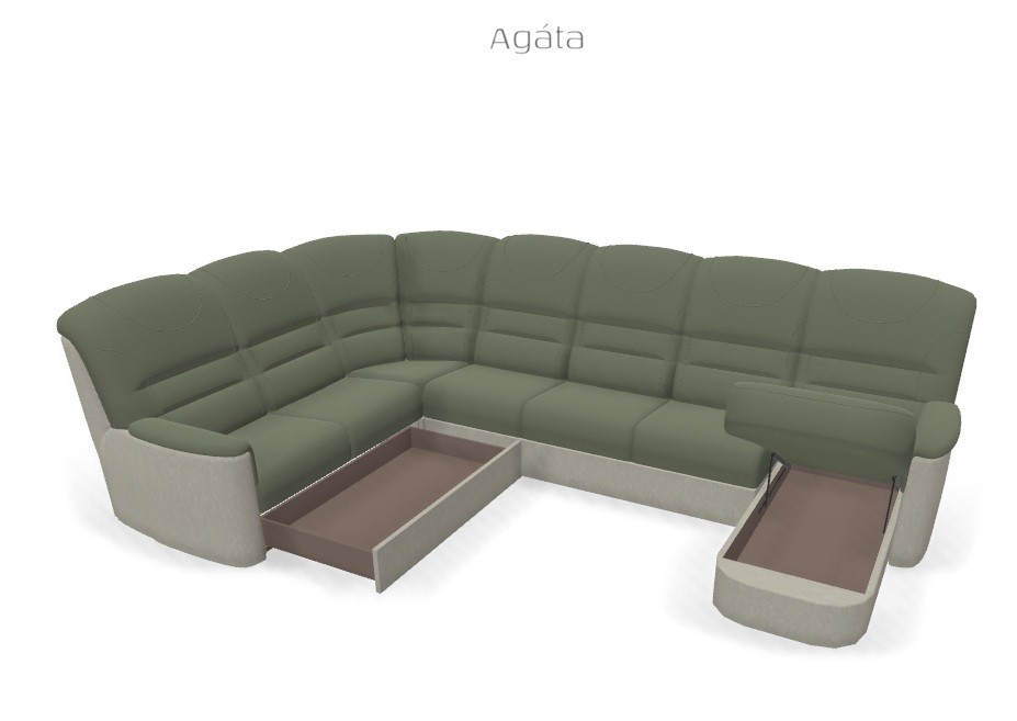 Sedací souprava Agáta ve tvaru U kombinuje praktický dvojsedák s úložným prostorem, rohový modul, trojsedák s rozkladem a rohový relaxační přístavek pro maximální pohodlí. Komfortní sezení zajišťují studené PUR pěny a odpružený systém. Pevná kostra z bukového a smrkového dřeva s LTD materiálem garantuje dlouhou životnost. Vysoký opěrák (107 cm) podporuje pohodlné sezení a relaxaci. Souprava je dostupná v široké škále potahových látek a nabízí nosnost až 130 kg na 1 osobu při sezení. Sedačku lze očalounit v mnoha potahových látkách i dvoubarevných látkách a také v kůži, stačí si vybrat, rádi Vám poradíme. Kvalitní český výrobek, elegantní a odolný.