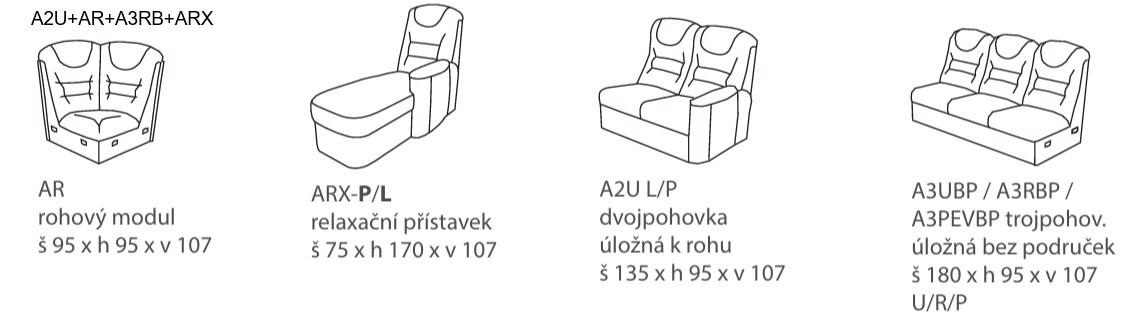 • Sestava ze 4 modulů: A2 (dvojsedák), AR (rohový modul), A3 (trojpohovka) a ARX (rohový relaxační přístavek).