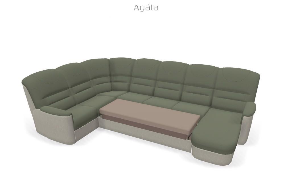 Rozkládací rohová sedací souprava Agáta ve tvaru U od českého výrobce nábytku Fagus. Souprava nabízí poctivou konstrukci z bukového masivu, pohodlné sezení a vysoké opěrky zad (107 cm). Agáta nabízí luxusní zpracování a rohový relaxační modul. Disponuje rozkladem i úložným prostorem. Díky svému nadčasovému tvaru a možnostem čalounění skvěle zapadne do moderních i tradičních interiérů. V nabídce velký výběr potahových látek, možnost kombinace dvou potahů.