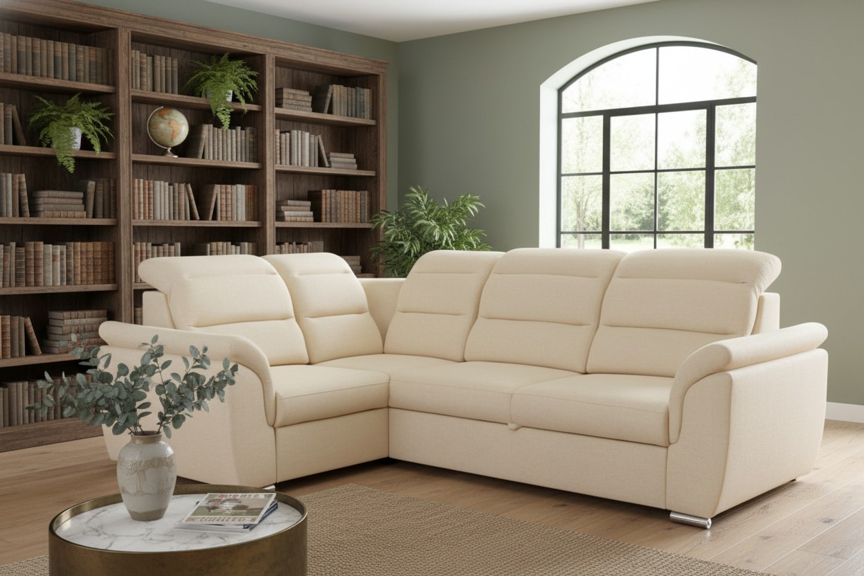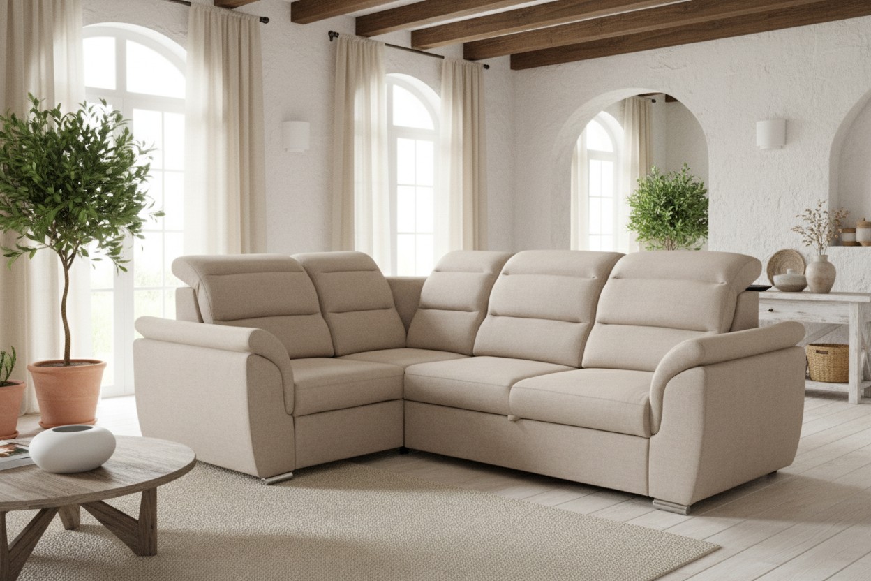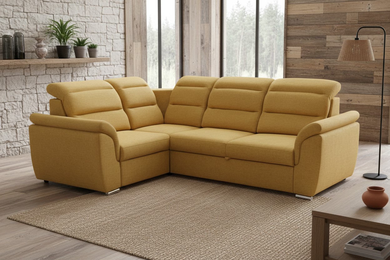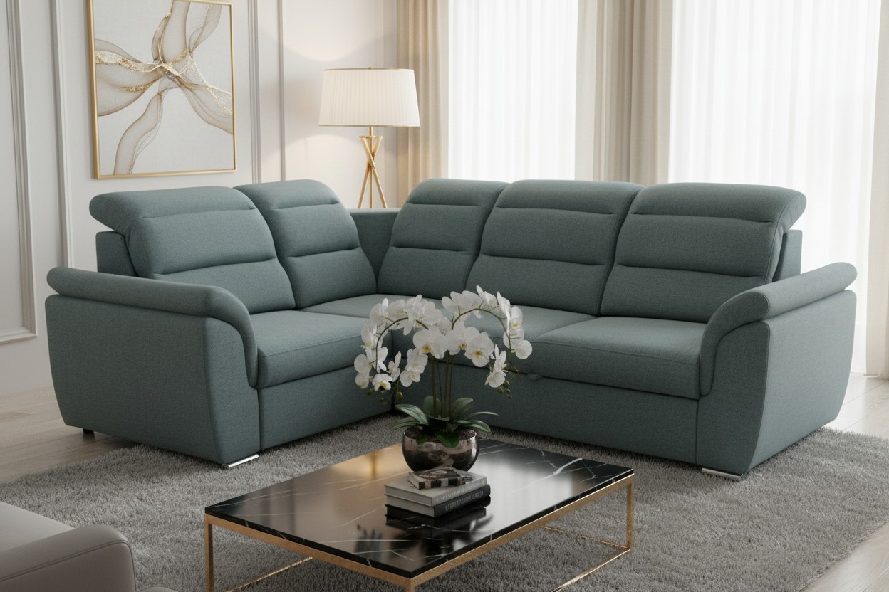 Moderní a elegantní rozkládací sedací souprava se stane oblíbeným centrem Vašeho obývacího pokoje. Základem výplně sedáku je kvalitní pružinové jádro se sendvičovou pěnou. Nožky jsou pochromované a má praktický úložný prostor. Sedací souprava je určena nejen do prostoru. Polohovatelné záhlavníky umožňují individuální nastavení pro ještě větší komfort.