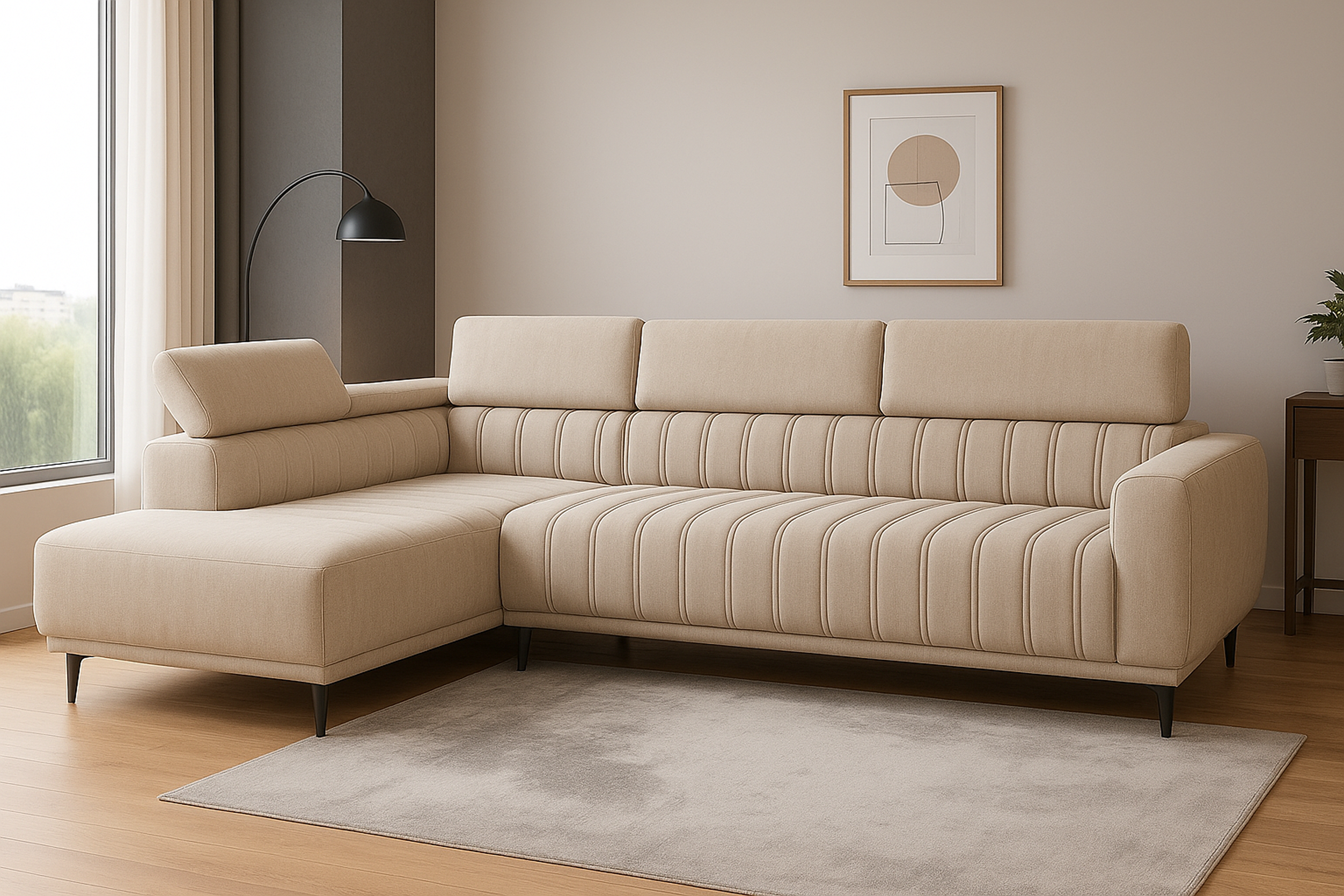 Provedení sedáku a opěráku kvalitní PUR pěnou SOFT LUX uloženou na vlnitých pružinách je pevné s elegantním prošíváním. Hlubší sed 56 cm zajistí komfort pohodlného sezení. Pohovka má polohovatelné záhlavníky které vám umožní ještě komfortnější posed.Sedací souprava lze objednat v pravém nebo levém provedení .Prosíme uveďte do poznámky.
