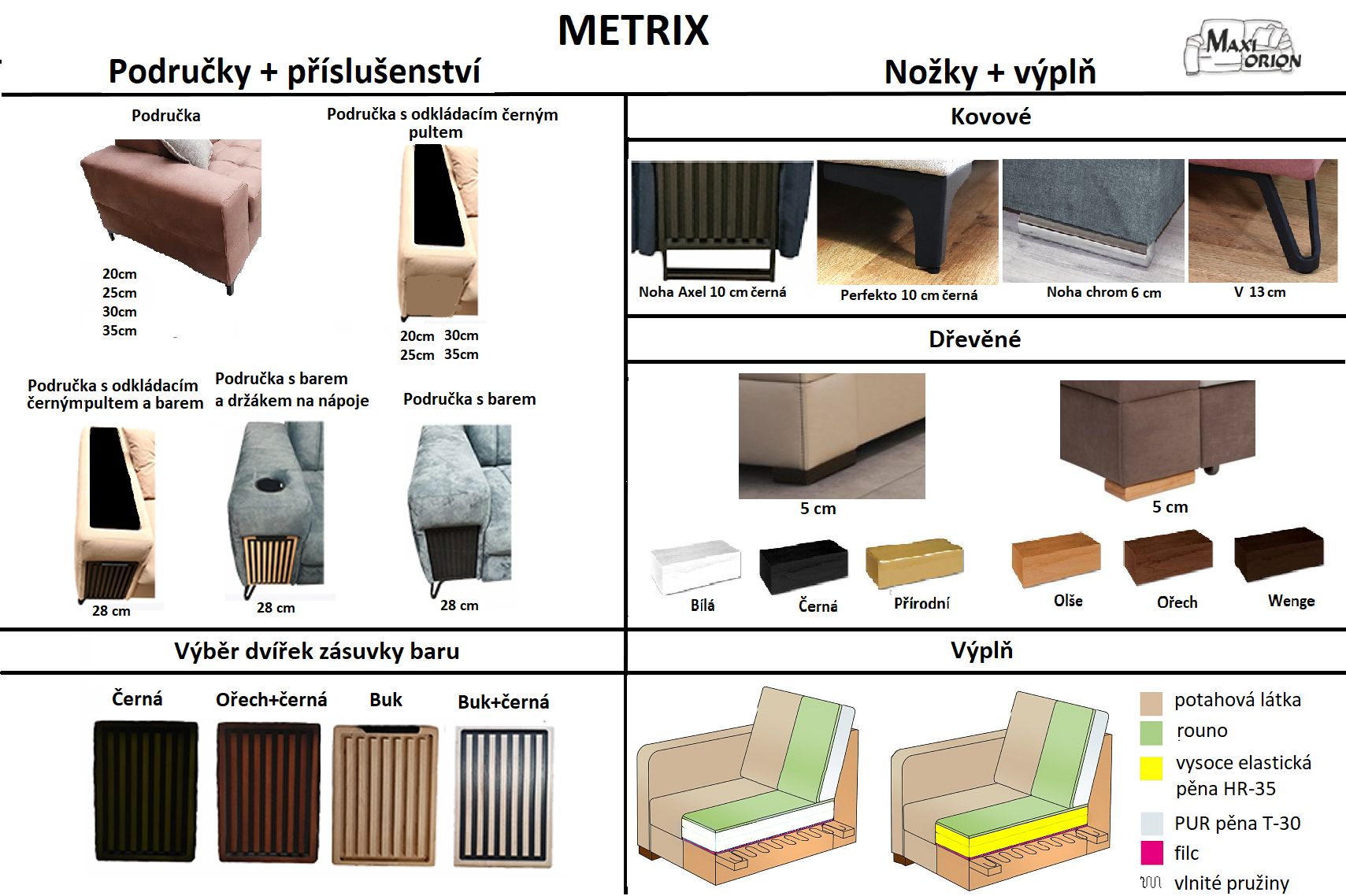 - Základem sedací soupravy Metrix je kostra z masivního dřeva, na které jsou umístěny vlnité pružiny typu B s vysoce elastickou studenou pěnou HR 35.