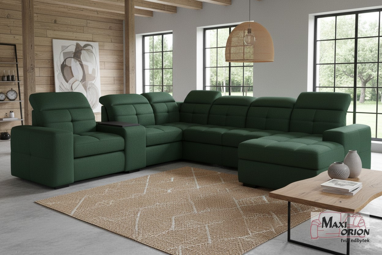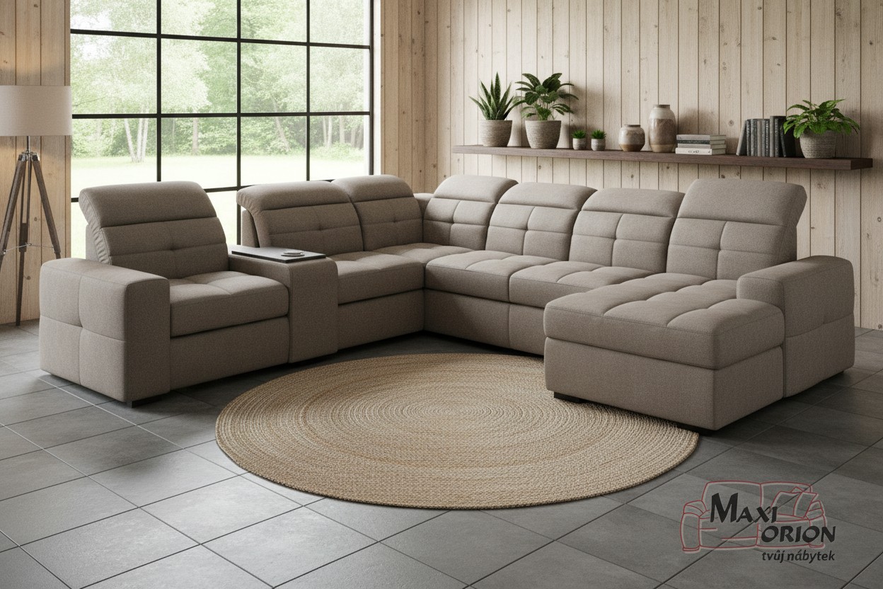 Velká rohová sedací souprava do U Kanton zaujme na první pohled a nabídne pohodlí, které si zamilujete. Sedací souprava je vyplněna HR pěnou a vlnitými pružinami Faliste. Sedačka má elektrické křeslo, 7 polohovatelných záhlavníků, 2 úložné prostory a rozklad typu delfín pro vytvoření lůžka. Nechybí ani bar s úložným prostorem, 2x zásuvky 230 V, 2x USB-C porty a 1x USB port.