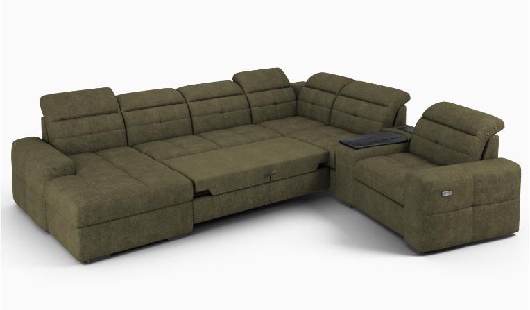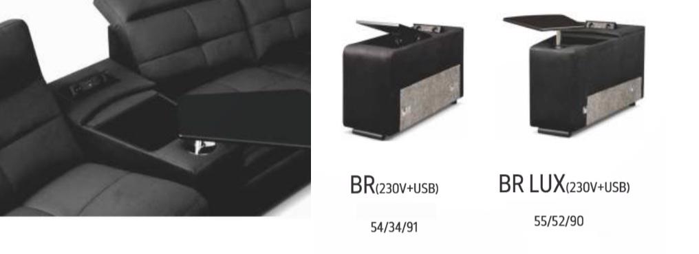 - Středová područka s barem: Integrovaný bar v područce zakrytý poličkou s USB portem a zásuvkou je vhodný pro prodloužení popřípadě zakřivení sedací soupravy a vkládá se mezi moduly. Z nabídky si můžete vybrat buď područku rovnou BR nebo pod úhlem 15 stupňů BR LUX, která mírně zakřiví sedací soupravu.