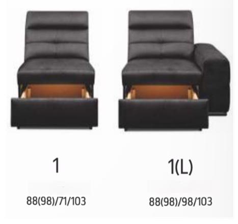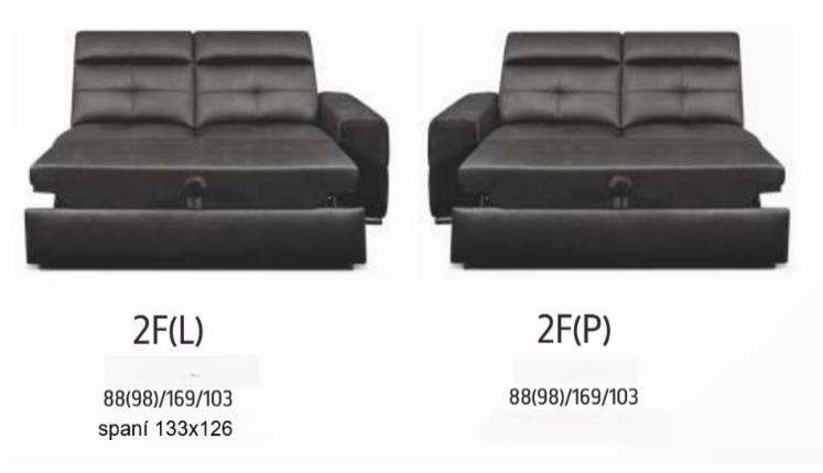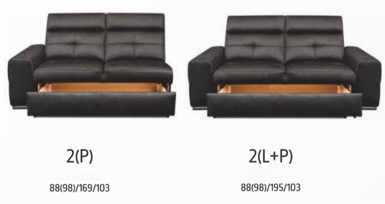 - Moduly s úložným prostorem: V modulech s úložným prostorem se nachází praktický šuplík pro uložení dek a lůžkovin. Šířka ukončovacích modulů s 2 s područkou je 169 cm. Pohovka 2(L+P) s dvěma područkami má šířku 195 cm.