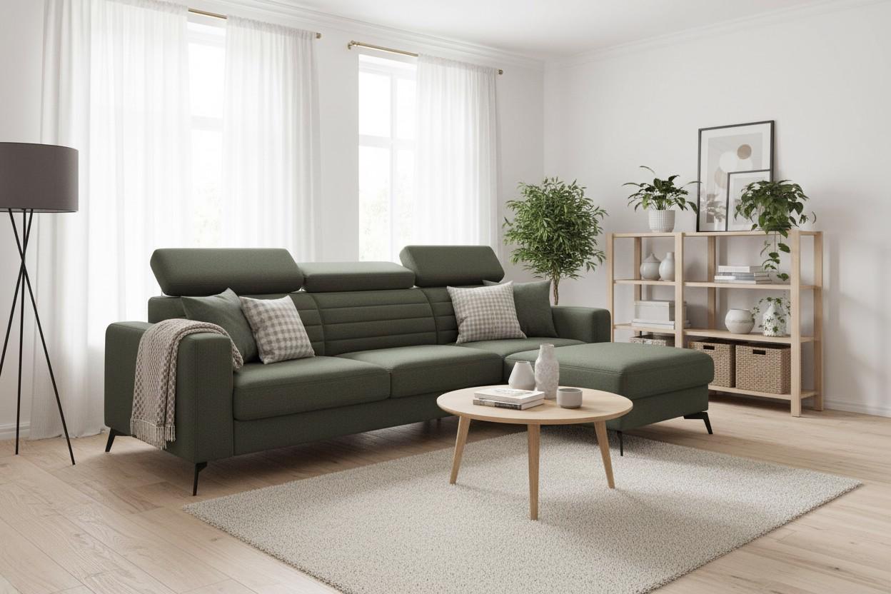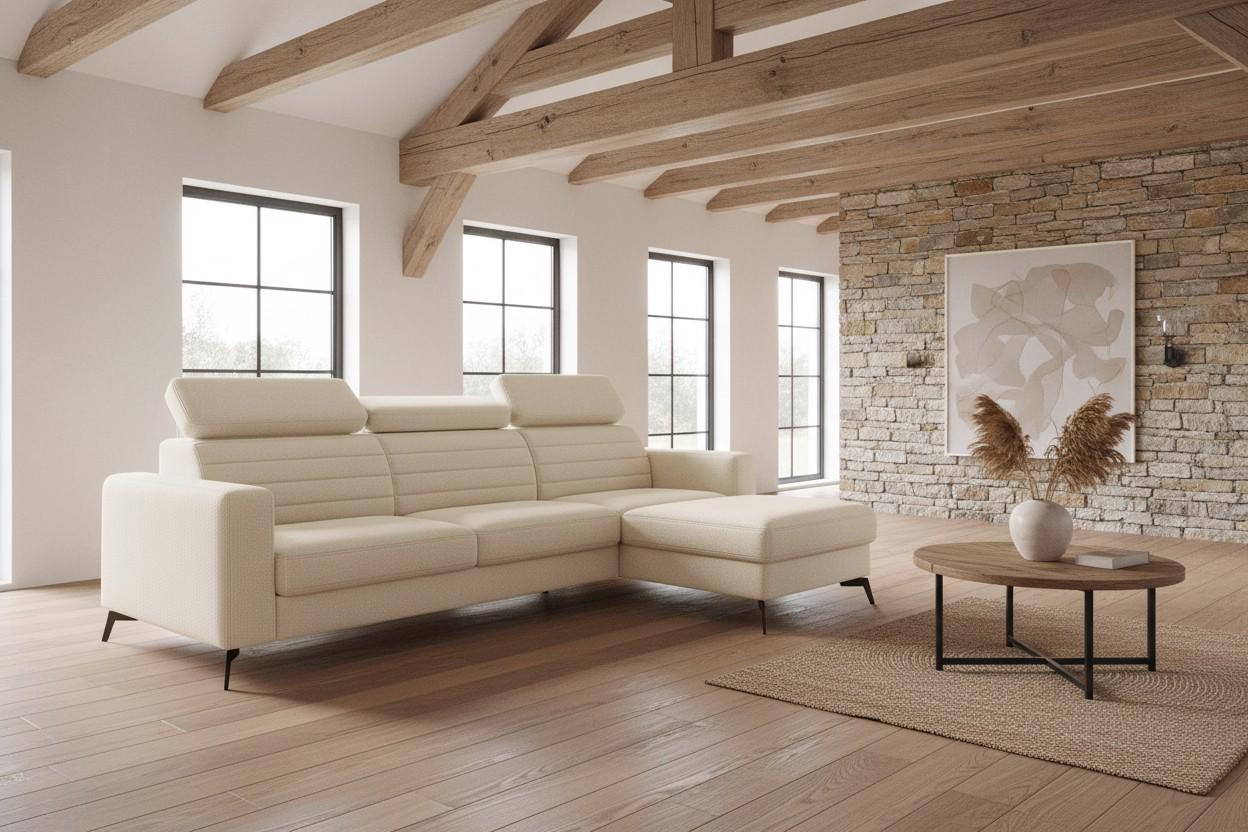 Moderní rohová sedací souprava Madeira zaujme svým elegantním designem a vysokým komfortem sezení. Polohovatelné opěrky hlavy zajišťují pohodlí, zatímco černé kovové nohy o výšce 12 cm podtrhují moderní vzhled a zároveň usnadňují úklid.