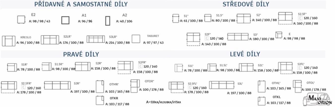 U jednotlivých částí sedací soupravy lze volit rozměry modulů dle přání zákazníka. Sedací soupravu můžete kombinovat ve více odstínech potahové látky. Moduly mohou plnit různé funkce jako třeba rozklad, úložný prostor, pohodlný otoman, roh, taburet, křeslo a pohovku malou a velkou. Dle Vašich rozměrů jsme schopni Vám navrhnout rohovou sedací soupravu do tvaru L nebo U, aby Vám přesně zapadla do Vašeho interiéru.