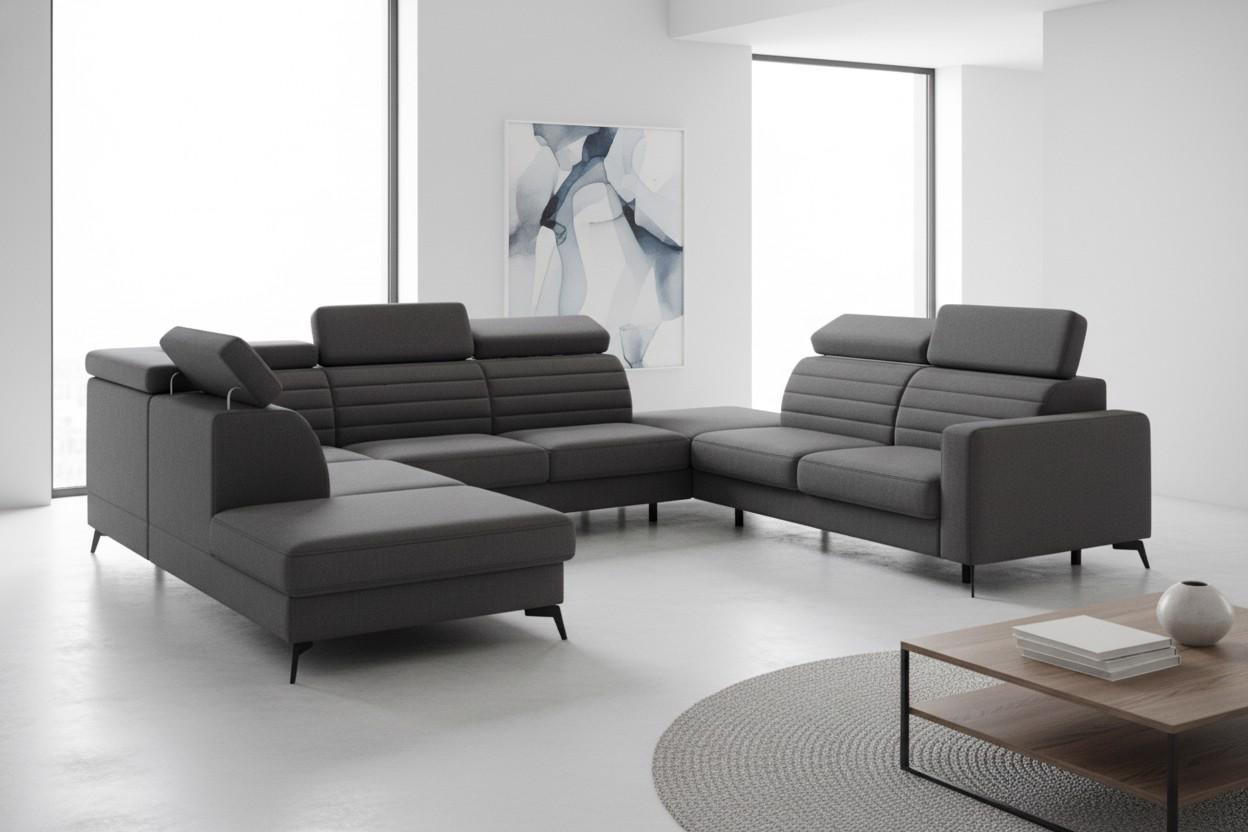 Rohová sedací souprava Madeira ve tvaru U zaujme svým moderním a elegantním designem. Nabízí prostorné a pohodlné sezení s polohovatelnými opěrkami hlavy, které ocení celá rodina i návštěvy. Díky čistému a nadčasovému vzhledu se snadno přizpůsobí každému modernímu interiéru a stane se jeho dominantním prvkem.