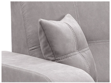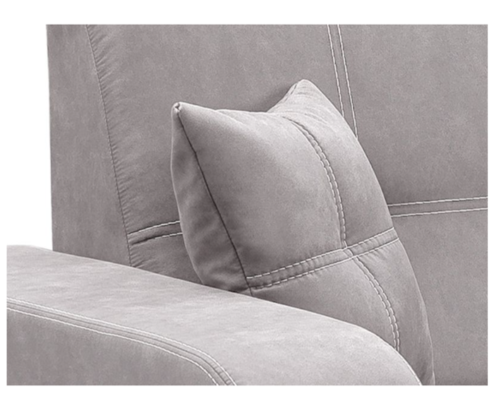 Sedačka je potažena světle šedou látkou s výrazným bílým prošitím.