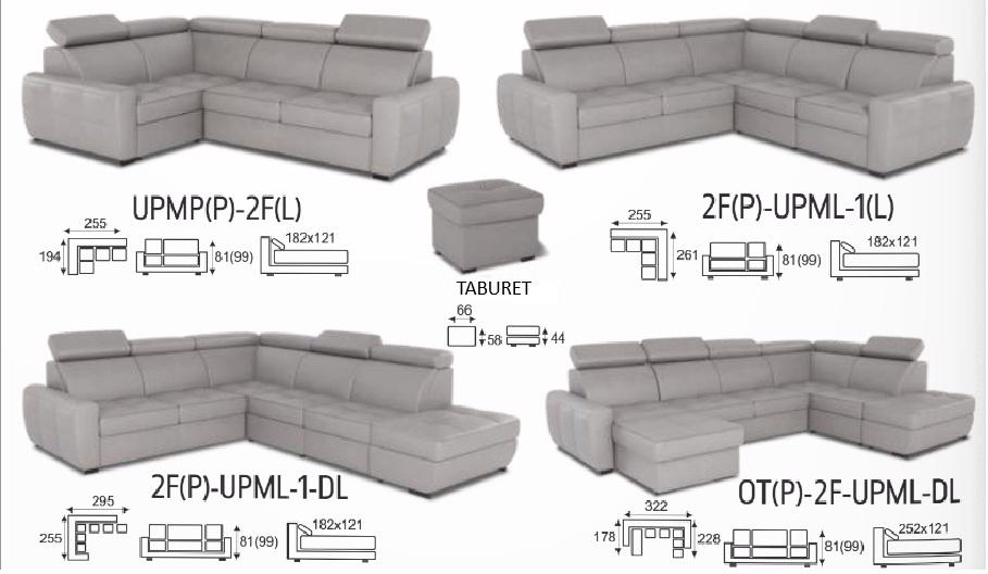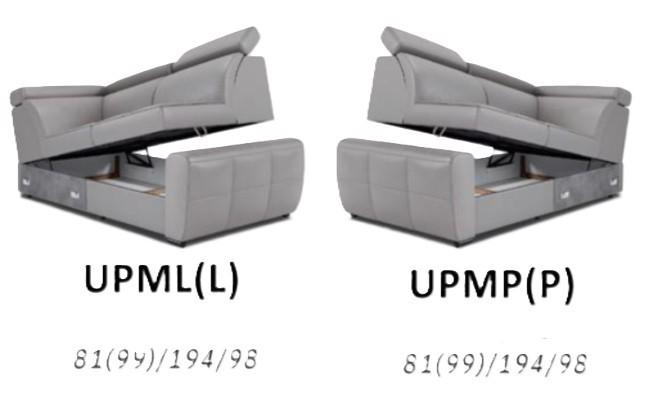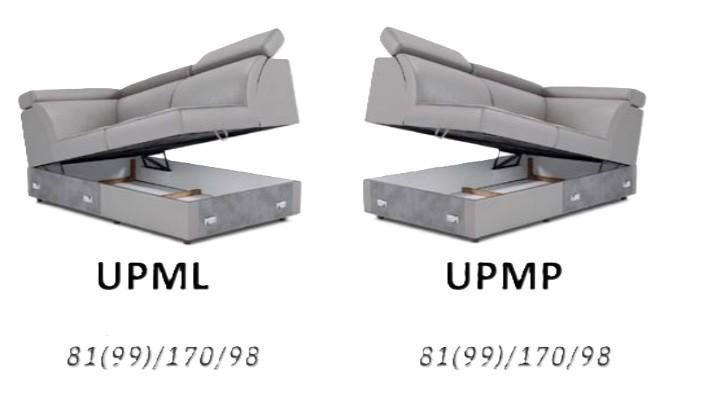 - Moduly s úložným prostorem: V modulech s úložným prostorem se nachází praktický šuplík např. pro uložení dek, polštářů a lůžkovin. Šířka rohových modulů UPMP+UPML je 170 cm a hloubka je 98 cm. Šířka modulů UPMP(L)+UPML(P) je 194 cm.