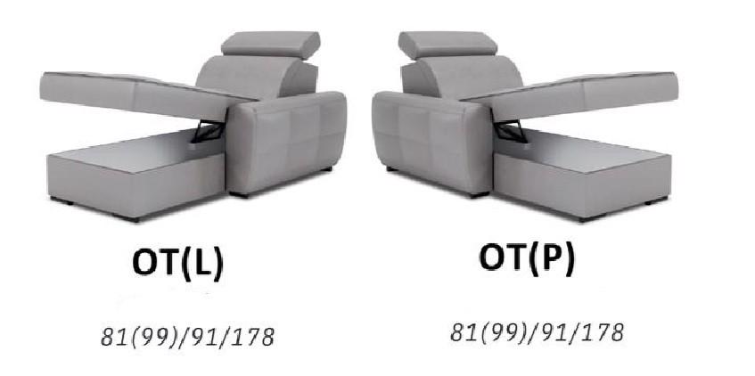 - Otoman: Ve velice pohodlném otomanu se nachází velký úložný prostor. Délka ukončovacích modulů OT (L+P) s područkou je 178 cm a šířka 91 cm.